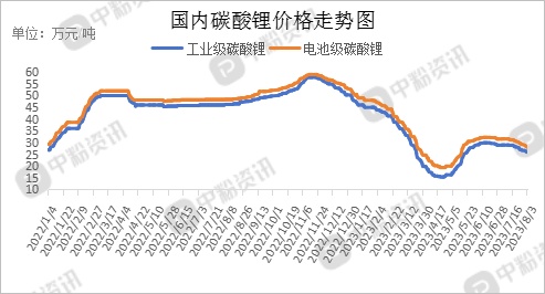 市场看空情绪浓厚,观望为主,下游采购积极性差,多询价,交投氛围一般。成本端进口锂矿持续稳中下跌,锂盐企业成本压力降低,持续严格把控原料成本。供应端,企业生产正常,供应基本维稳,其中青海盐湖产量不断增加,供应端预期增量。需求端,终端新能源汽车以及数码市场需求状况变化不大,下游正极材料企业谨慎采购,随着碳酸锂价格持续下跌,采购压价心理明显。目前来看,现货市场短期需求淡季,供需持续博弈僵持,市场价格维稳震荡下行为主。(所有数据截至8月3日)