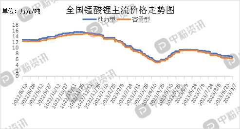 市场概述:本周,国内正极材料市场依旧延续前期弱稳下行趋势,价格不断下滑,止跌较为困难。截止到目前,国内动力型磷酸铁锂市场主流报价在7.1万元/吨左右,环比上周下滑5.33%,储能型磷酸铁锂主流成交价在6万元/吨左右,环比上周下跌6.25%;动力型锰酸锂市场报价为6.75万元/吨,环比上周下降6.25%,容量型锰酸锂成交价在6.25万元/吨,环比上周跌幅为3.85%。近期价格连续下探,市场观望情绪浓厚,交投氛围较为冷清,市场积极性不高。当前大厂多以交付前期长协订单为主,散单多集中在小型企业,上下游市场博弈僵持氛围较浓。 原材料端碳酸锂价格不断下滑,市场走势下行,正极材料企业成本支撑力度减弱,下游电池企业在“买涨不买跌”心态影响下,采购脚步放缓,多以刚需购买为主。下游数码市场和小动力市场需求表现稍显弱势,不及预期,新能源汽车发展向好,出货数量稳中增加,预计短期内正极材料市场稳中走弱可能性较大。(所有数据截至9月7日)