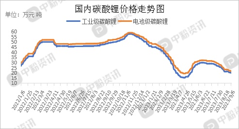 上游市场行情:本周,碳酸锂市场交投氛围仍显冷清,价格持续弱稳下行为主。据了解,目前,工业级碳酸锂主流出厂报价降至19.99万元/吨左右,电池级碳酸锂主流市场价格在21.59万元/吨。