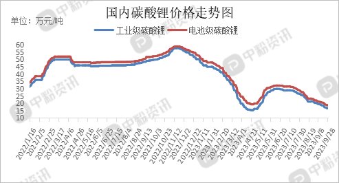 上游碳酸锂市场行情:近期,国内碳酸锂价格走势仍持续下行态势,下游需求差,市场弱势。随着碳酸锂价格持续下降,下游采购心理价位越低,临近节假日仍以观望为主,市场交投氛围较差,价格也承压下行。据了解,当前国内工业级碳酸锂主流出厂在16.69万元/吨左右,电池级碳酸锂主流成交价格在18.74万元/吨左右。短期来看供需仍处于博弈状态,碳酸锂价格偏弱运行为主。(所有数据截至9月28日)