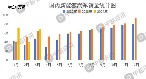 终端新能源汽车市场,新能源乘用车企业总体走势较强,多地促消费政策持续发力,以旧换新政策也引发强烈的消费期待。据乘联会数据了解,3月1-31日,新能源车市场零售69.8万辆,同比增长28%,环比增长80%,今年以来累计零售175.8万辆,同比增长34%;全国乘用车厂商新能源批发81.9万辆,同比增长33%,环比增长83%,今年以来累计批发195.6万辆,同比增长31%。