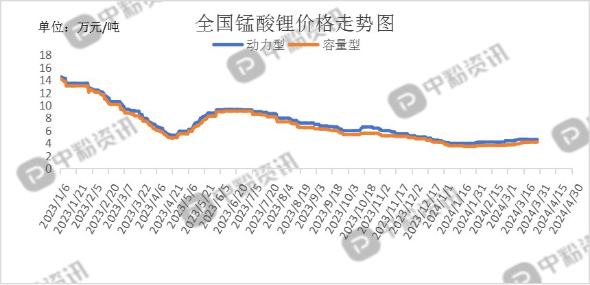 市场概述:本月,正极材料市场运行稳定,产品价格波动不大。磷酸铁锂本月月初价格小幅度上升,月中价格小幅度下调之后又趋于平稳;锰酸锂价格维持平缓。截至目前,国内动力型磷酸铁锂市场主流报价为4.36万元/吨,储能型磷酸铁锂市场成交价在4.21万元/吨左右;动力型锰酸锂主流出厂价为4.6万元/吨,容量型锰酸锂市场主流报价为4.2万元/吨。上游原料碳酸锂月末价格小幅震荡,锂货商对后市价格保持冷静观望态度,市场整体交投变化不大,企业订单多以长期交付为主,中小型企业散单较多。下游电芯企业需求不高,市场出货量一般。预计后期正极材料市场运行平缓,价格变化波动不大。(所有数据截至4月30日)