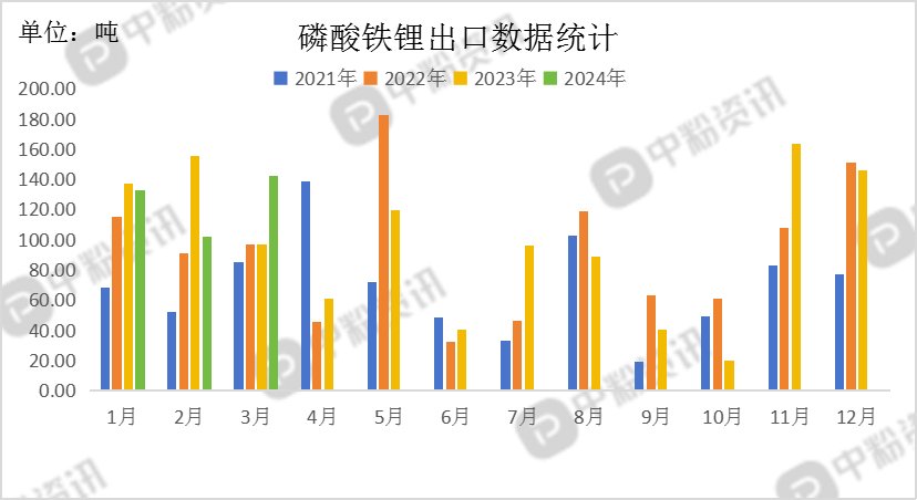 进出口数据:海关统计,2024年3月我国磷酸铁锂当月进口量为0.4吨,累计进口量为44.01吨,进口量环比下跌95.01%,进口量同比下跌94.48%,累计进口量比去年同期下跌48.82%。