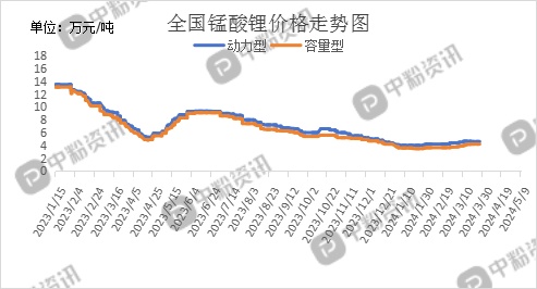 市场概述:本周,国内正极材料市场下游需求回升,多数企业持观望态度。截至目前,国内动力型磷酸铁锂市场主流报价为4.34万元/吨,环比上周下调0.46%;储能型磷酸铁锂主流成交价在4.19万元/吨,环比上周下调0.24%;动力型锰酸锂市场均价在4.65万元/吨左右,环比上周上调1.09%;容量型锰酸锂市场主流报价在4.25万元/吨,环比上周上调1.19%。市场整体运行平稳,上游原料碳酸锂价格大稳小动,锂货商们以谨慎态度观望后市情况,五一节后碳酸锂市场交较为平静,从供需情况来看,多数正极材料企业在四月中旬碳酸锂现货价格较低时进行提前备货。订单方面,头部企业以合约客户为主,新增订单还需时间。终端新能源需求有所回升,但短期内正极材料成本面未获得利好因素,预计后期正极材料市场运行向好。(所有数据截至5月9日 )