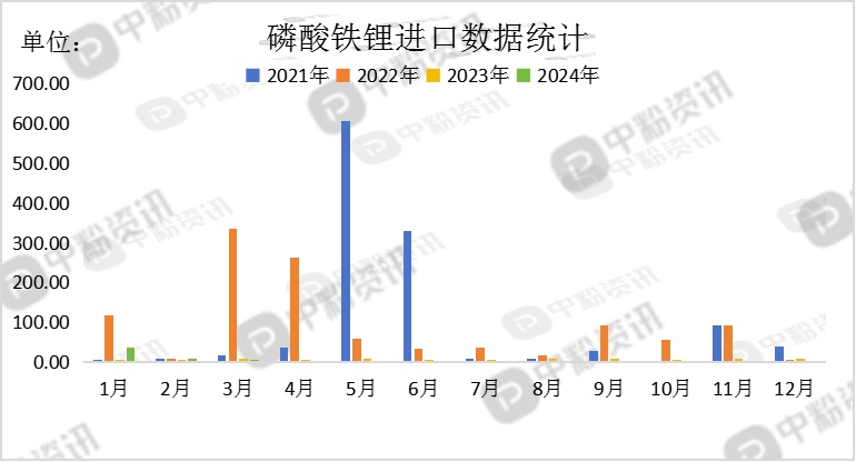 进出口数据:海关统计,2024年3月我国磷酸铁锂当月进口量为0.4吨,累计进口量为44.01吨,进口量环比下跌95.01%,进口量同比下跌94.48%,累计进口量比去年同期下跌48.82%。