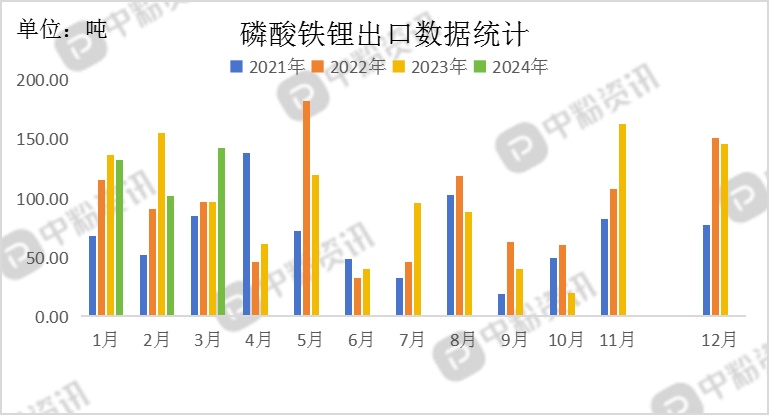 海关统计,2024年3月我国磷酸铁锂当月出口量为1.42吨,累计出口量为3.77吨,出口量环比上涨139.46%,出口量同比下跌98.53%,累计出口量比去年同期下跌39.32%。