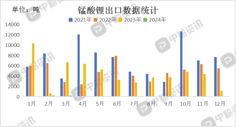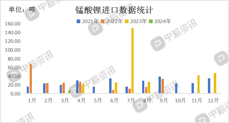 海关统计,2024年3月我国锰酸锂当月进口量为7.80吨,累计进口量为7.80吨。