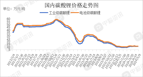 上游市场行情:碳酸锂周期性波动不明显,本周并未发生明显的价格变化,市场稳定性较强,需求端以及市场情绪的变化不明显。截至目前,工业级碳酸锂主流出厂报价在10.91万元/吨左右;电池级碳酸锂主流出产报价在11.15万元/吨左右。上游原料端利好因素支撑明显,阿坝锂矿建设火热,200万吨原矿产能或年内投产的消息传来。近日,随着新能源汽车“以旧换新”、车价调整等政策的影响,将会进一步刺激终端消费市场。(所有数据截至5月9日)