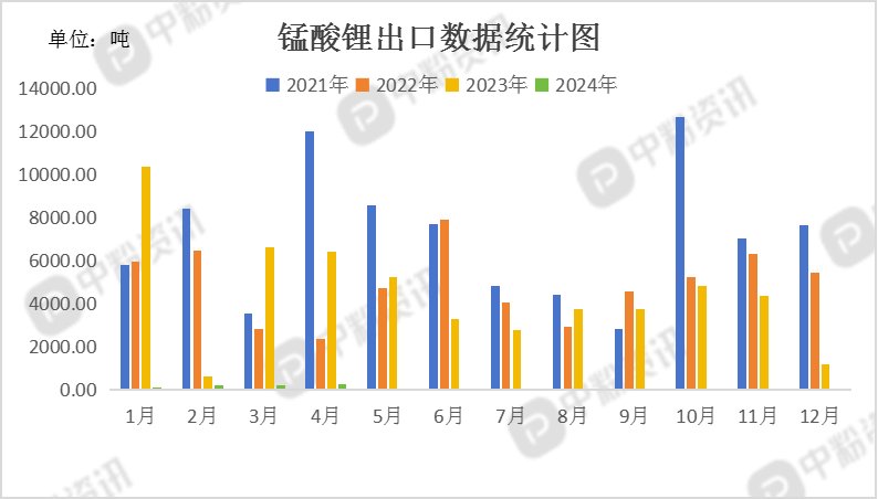 海关统计,2024年4月我国锰酸锂当月进口量为0.00吨,累计进口量为7.81吨。累计进口量比去年同期下跌63.98%。