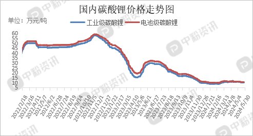 上游市场行情:5月份,碳酸锂价格波动周期短且反复。月初,碳酸锂价格呈现持续走跌趋势;月中,碳酸锂价格持稳后又小幅上涨;月末,碳酸锂价格小幅下跌。上游部分锂盐厂出货价格坚挺,买家高价接受意愿低,市场成交氛围冷清。下游多数正极企业库存量较多,在客供量提升的影响下而缺乏采购现货的意愿。6月,随着碳酸锂市场供应维持充裕,预计后期碳酸锂市场弱稳运行。(所有数据截至5月30日 )