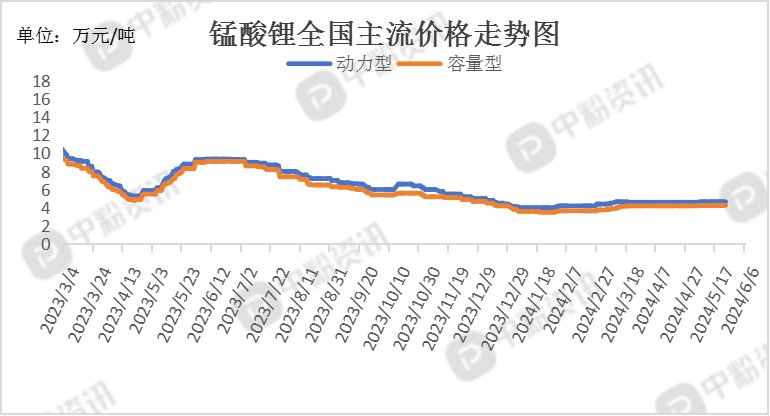 市场概述:本周,正极材料产品价格持续走跌,正极材料市场稳中走弱。截至目前,国内动力型磷酸铁锂市场主流报价为4.19万元/吨,环比上周下调1.18%;储能型磷酸铁锂主流成交价在4.05万元/吨,环比上周下调1.22%;动力型锰酸锂市场主流成交价在4.65万元/吨,容量型锰酸锂市场主流报价在4.25万元/吨。上游原料端碳酸锂价格持续走跌,正极材料成本面支撑不足,市场商谈氛围冷清,从需求端来看,由于终端消费需求不及预期,下游电芯企业以去库为主,减少原料和产品的库存积压,维持刚需采购,对磷酸铁锂材料的需求较为有限。预计后期正极材料市场运行态势较弱。