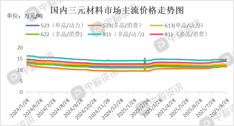 市场概述:本周的三元材料市场整体呈现稳中偏弱,需求承压的格局,价格重心略有下移。不同型号的材料表现有所分化。三元材料行业整体供应充足,甚至部分环节存在过剩情况。前期行业扩张积累了较多产能,但目前消化速度较慢。