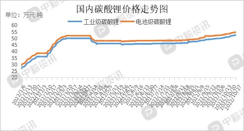 上游碳酸锂行情:10月,国内碳酸锂市场价格持续上扬,下游产能扩张迅速,产能释放速度加快,询价积极性高,目前原料价格一路攀升,原料货源紧缺、现货市场供应紧张,低价货源难寻。企业装置开工正常,产量平稳,青海、江西等地仍受疫情影响,运输受阻。从资源端来看,澳锂矿商皮尔巴拉锂精矿成交价再创新高,成交价为7255美元/吨,较10月18日成交价涨2.18%,碳酸锂企业生产成本压力持续增加。据了解,当前碳酸锂价格高位运行,截至目前工业级碳酸锂主流出厂价格在52.5-54万元/吨,电池级碳酸锂主流出厂价格在53.5-57万元/吨。(所有数据截至10月27日)