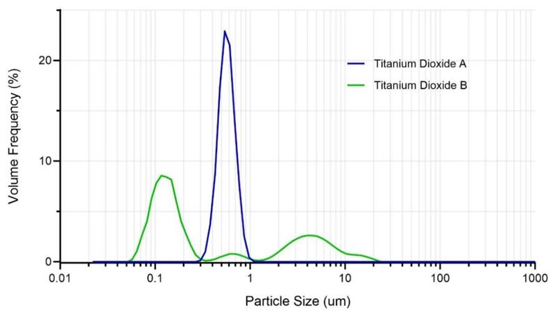 图3 二氧化钛A和二氧化钛B的粒度分布
