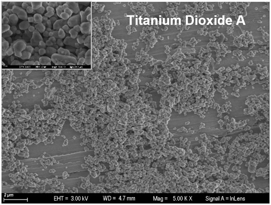 图4 二氧化钛A(x 5K)、二氧化钛B(x 50K)的SEM图像