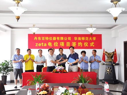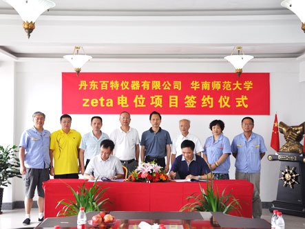 7月21日,丹东百特与华南师范大学Zeta电位合作项目在百特签约,百特公司总经理董青云先生和华南师范大学物电学院副院长韩鹏教授在协议上签字。出席签约仪式的领导和专家有丹东市经信委主任曹香安先生,华南师范大学科技处处长聂瑞华先生,副处长谢红苗先生、著名仪器专家何振江教授、百特副总经理刘忠兰女士等。