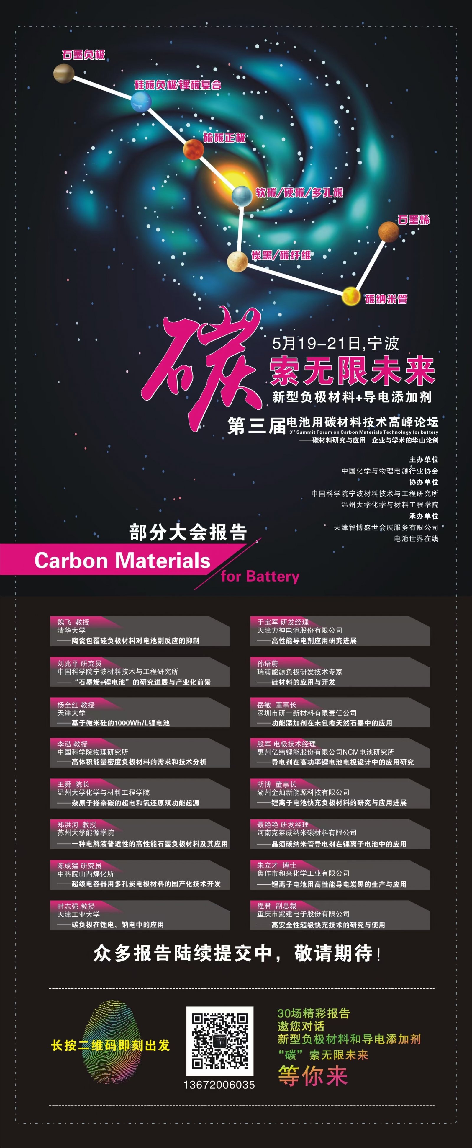 本次大会由中国化学与物理电源行业协会主办,中国科学院宁波材料技术与工程研究所、温州大学协办,将集中探讨:碳材料作为“高性能电极材料+新型导电添加剂”的技术与研究。
