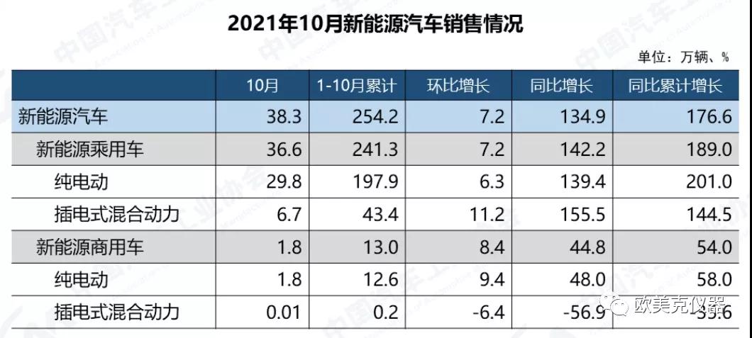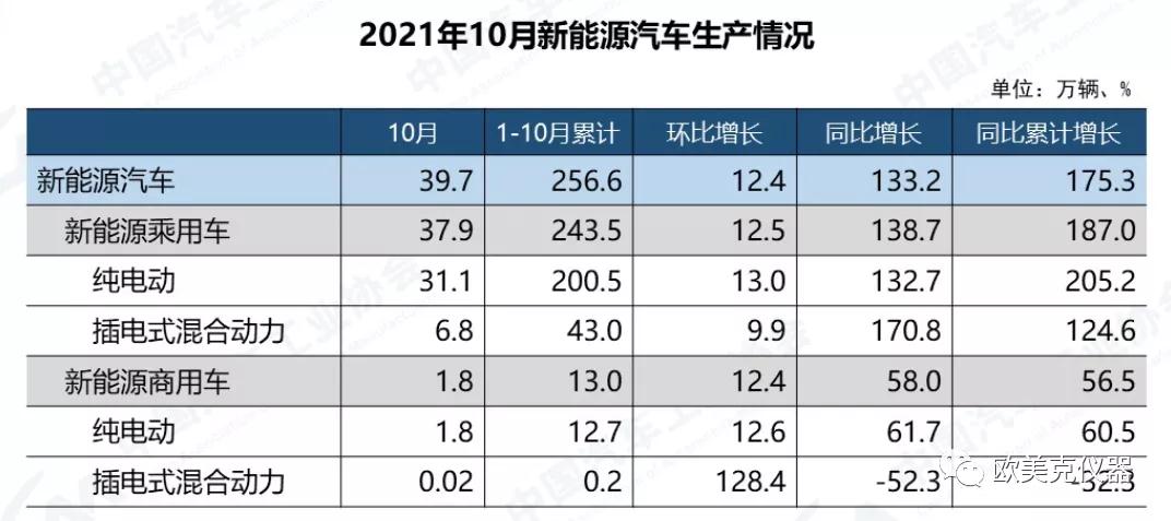 近日,中国汽车工业协会发布了2021年新能源汽车行业经济运行指标,前十个月累计生产新能源汽车256.6万辆,同比累计增长175.3%;累计销售新能源汽车254.2万辆,同比累计增长176.6% 。产、销数量均创历史新高,下面来看具体数据: