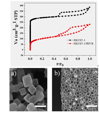 (1)纯MOF与多级孔修饰MOF结构的氮气吸脱附曲线变化,对应的SEM变化,其中红线代表的多级孔修饰MOF结构。