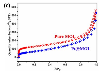 由上图可以看出,金属有机框架材料经过贵金属的负载之后,占据了金属有机框架的孔道,微孔减少和比表面下降。