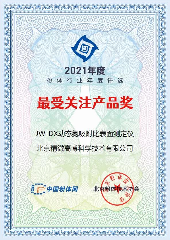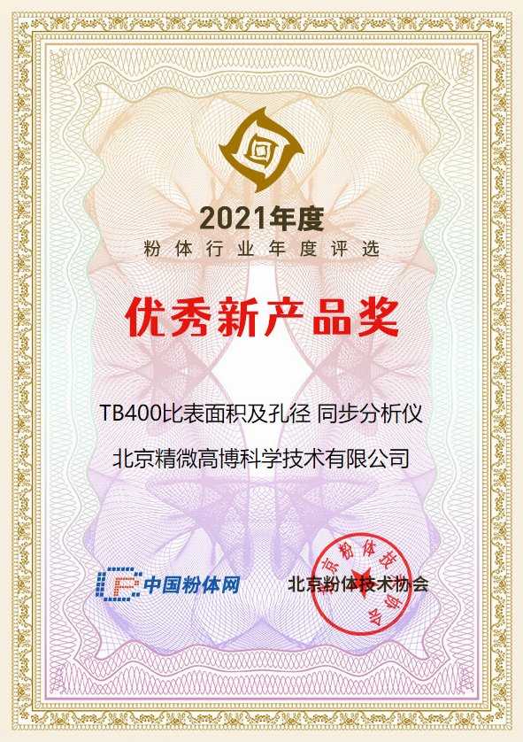 在刚刚结束的2021年度粉体行业“优秀新产品”评选活动中, 精微高博在众多厂商的激烈竞争中脱颖而出,TB400系列比表面积及孔径同步分析仪荣获2021年度粉体行业“优秀新产品奖” ,JW-DX动态氮吸附法比表面积仪荣获2021年度粉体行业“最受关注产品奖” 。