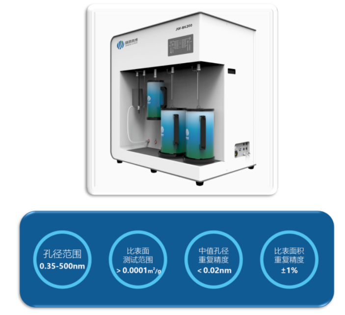 实验中用到的比表面积测试仪为JW-BK200C比表面及孔径分析仪,JW-BK200C比表面及孔径测试仪配置1torr/0.1torr高精度小量程传感器,及10-8Pa涡轮分子泵,适合分子筛、催化剂、活性炭等多微孔样品的超微孔分析。