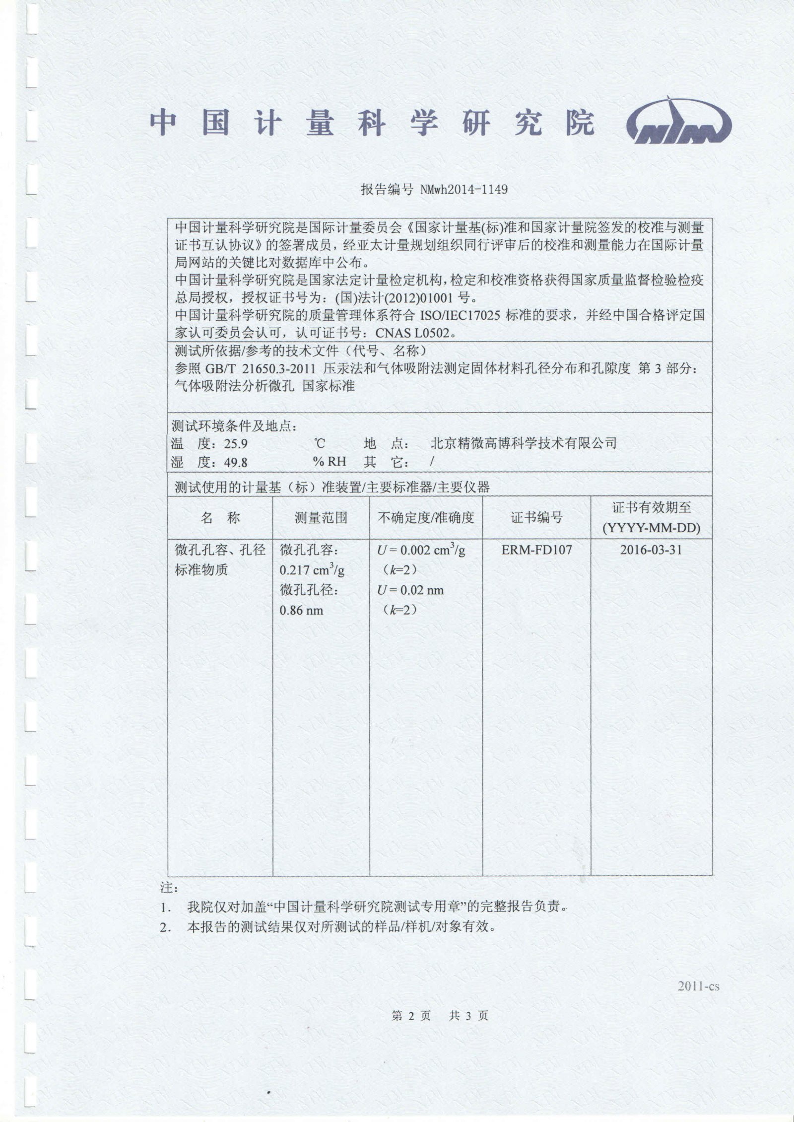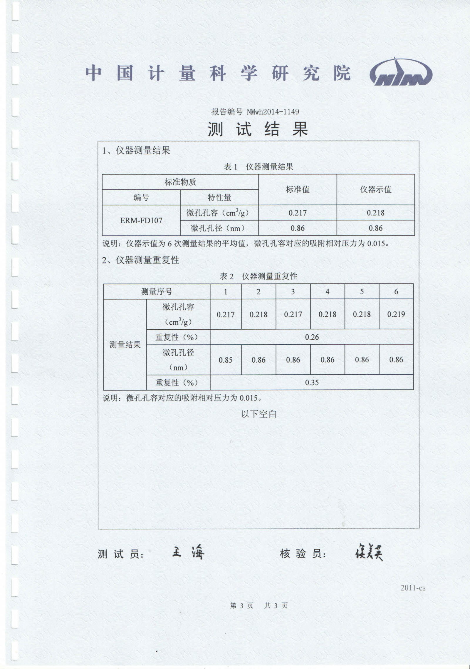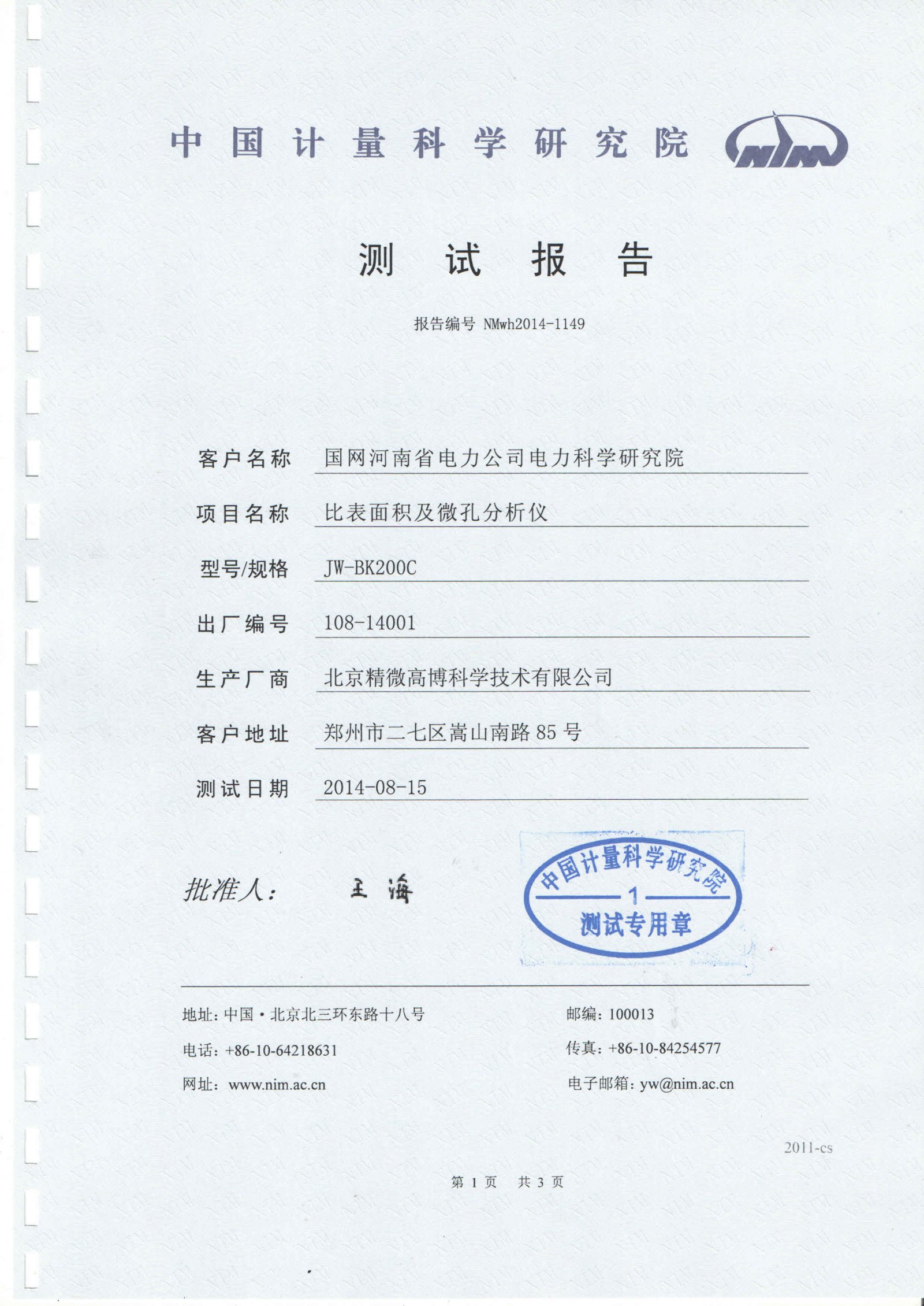 由于此台中标仪器,使用单位要求做计量认证,就此北京精微高博公司请了中国计量研究院的相关工作人员,对此台仪器进行了现场测试,经过六次的相关测试,此台仪器(高端高性能微孔分析仪JW-BK200C)成功通过了中国计量科学研究院的计量认证,完全打破国产微孔分析仪“零计量”记录,标志着精微高博微孔分析技术达到国际先进水平。中国计量院计量报告如下图所示: