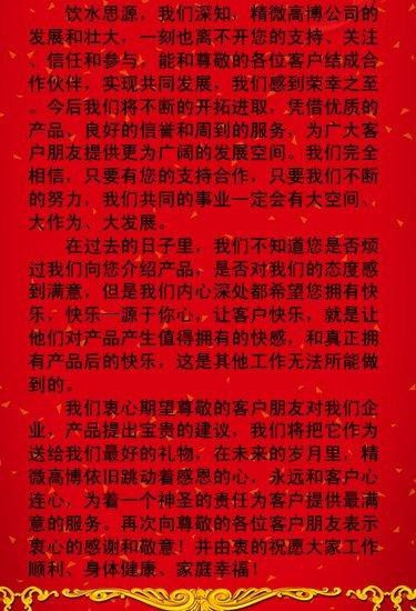 我们衷心期望尊敬的客户朋友对我们企业,产品提出宝贵的建议,我们将把它作为送给我们最好的礼物,在未来的岁月里,精微高博依旧跳动着感恩的心,永远和客户心连心,为着一个神圣的责任为客户提供最满意的服务。再次向尊敬的各位客户朋友表示衷心的感谢和敬意!并由衷的祝愿大家新年快乐、工作顺利、身体健康、家庭幸福!
