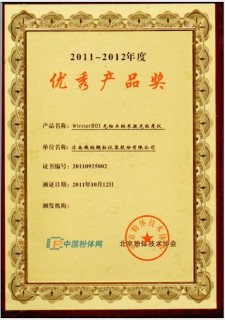 在“2011中国粉体工业发展年会”上举行隆重的证书颁发仪式,Winner801以其领先的测试性能,得到了评审专家组的一致认可,并荣获“2011-2012年度 优秀产品奖”。微纳仪器填补了国内纳米颗粒测试的空白,其性能与国外同类产品相媲美,得到了过大客户的好评。Winner801是民族产品的骄傲,它将时刻激励着济南微纳向更高的技术攀登,永不停歇的脚步与客户共创美好未来!