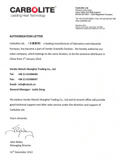 自2013年1月1日起,Carbolite(卡博莱特)在中国大陆、香港、澳门的业务将由弗尔德莱驰(上海)贸易有限公司全权负责,原销售渠道将统一由莱驰(RETSCH)销售团队和销售渠道管理。弗尔德莱驰(上海)贸易有限公司(Verder Retsch Shanghai Trading Co., Ltd.)是弗尔德集团(Verder Group)在华设立的全资分公司,隶属于弗尔德科学仪器事业部(Verder Scientific Division),全面负责德国RETSCH(莱驰)粉碎、研磨、筛分、粒度粒形分析仪及英国Carbolite(卡博莱特)马弗炉在中国的市场销售、推广和技术服务。总部位于上海,在北京、广州等大城市均设有办事处及实验室。