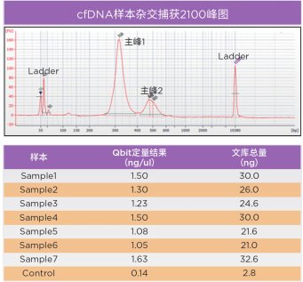 上图: 片段分析,其中主峰1和2为杂交捕获后cfDNA目标片段峰;