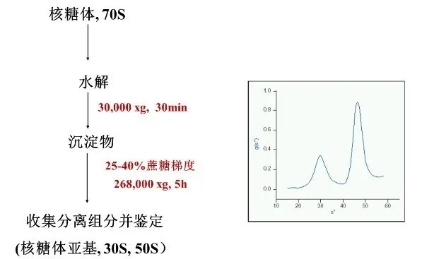 速率区带离心经典的应用就是通过蔗糖密度梯度离心,进行各种亚细胞器(核糖体、线粒体、Exosome 等)和病毒颗粒(病毒载体、疫苗等)的纯化。例如,我们在上一期中得到的 70S 核糖体沉淀,经过水解后,可利用蔗糖密度梯度离心,进一步分离纯化得到 50S 和 30S 的两个亚基。具体的实验流程如下: