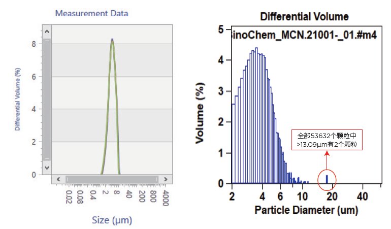 Multisizer3/4e库尔特计数及粒度分析仪的特性可以实现锂离子电池正负极材料中异常大颗粒的有效检测。如下图所示,正负极材料颗粒使用激光粒度仪得到Dmax为12.22-um(左图),以此判断最大颗粒是12.22-um是否正确?使用库尔特法对这些颗粒进行检测,可以更好地监测极少量的异常大颗粒,从右图中可以发现13-um以上还有2个大颗粒。