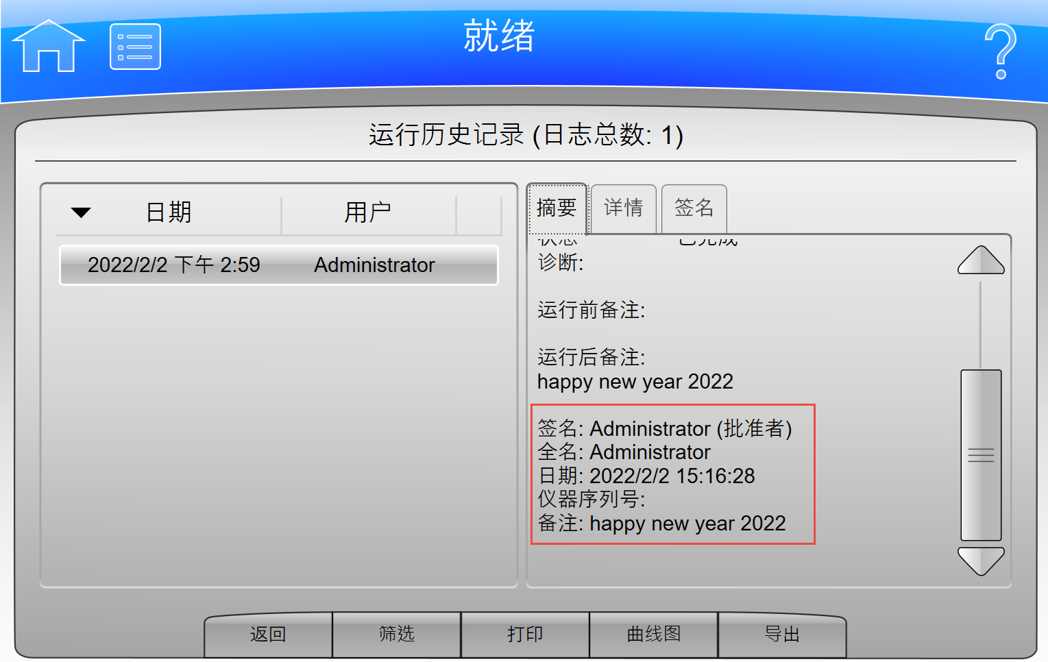 上图:以PDF格式输出的运行记录包含了电子签名、备注以及运行曲线图等信息。