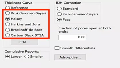 Halsey 方程是 BJH 方法中最常用的吸附层膜厚计算模型,此模型假设单层吸附液膜和液态吸附质有着相同的密度和堆积方式,并且适用于较高的相对压力区域(多层吸附区域)的分析。