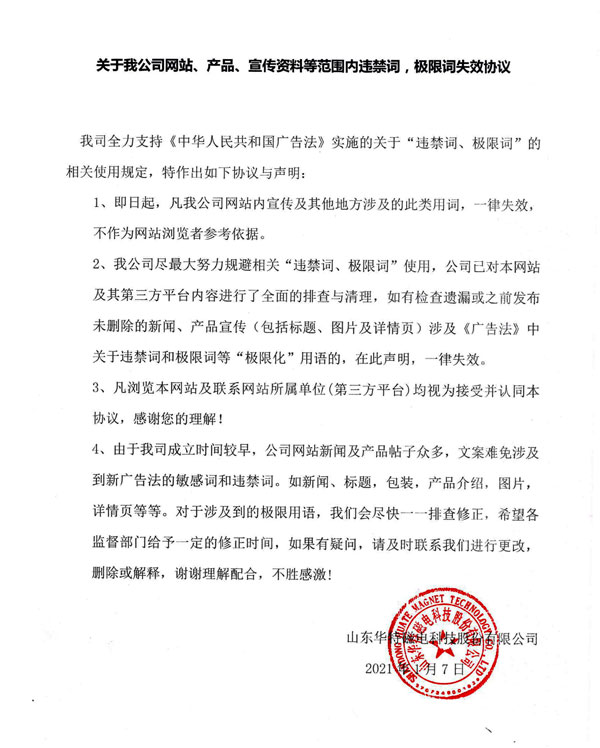 关于我公司网站、产品、宣传资料等范围内违禁词,极限词失效协议