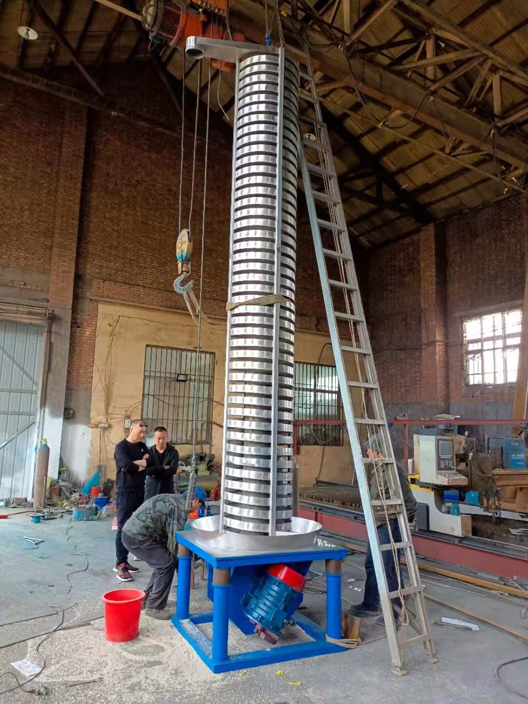 该设备的驱动装置,即振动电机安装在输送塔下部,两台振动电机对称交叉安装,输送塔由管体和焊接在管体周围的螺旋输送槽组成,输送塔座于减振装置上,减振装置由底座和隔振弹簧组成。当垂直输送机工作时,根据双振动电机自同步原理,由振动电机产生激振力,强迫整个输送塔体作水平圆运动和向上垂直运动的空间复合振动,螺旋槽内的物料则受输送槽的作用,作匀速抛掷圆运动,沿输送槽体向上运动,从而完成物料的向上输送作业。