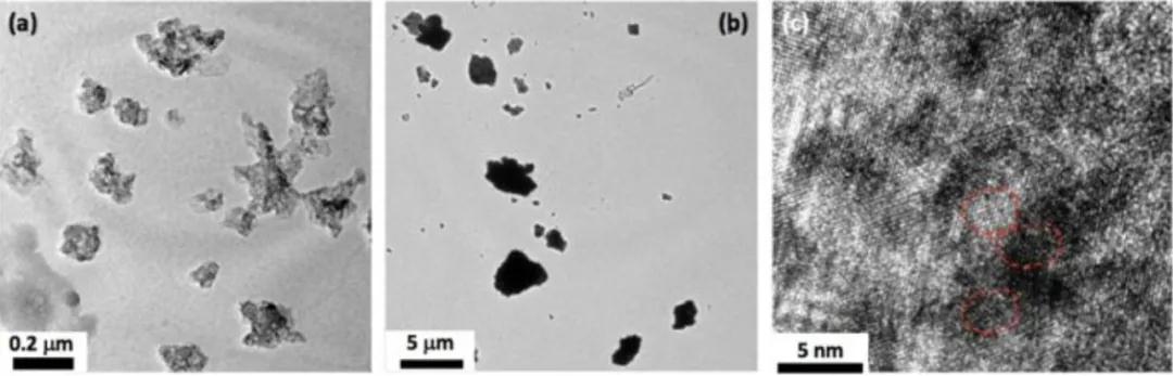 (a)BMG_30的低倍率TEM图像,(b)BMG_100的低倍率TEM图像,(c)BMG_100的高分辨率TEM图像。
