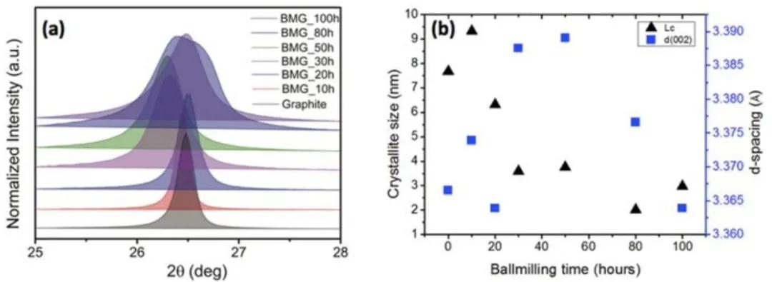 (a) 从球磨石墨中获得的XRD曲线, (b)球磨石墨颗粒中晶粒尺寸和晶面间距的变化