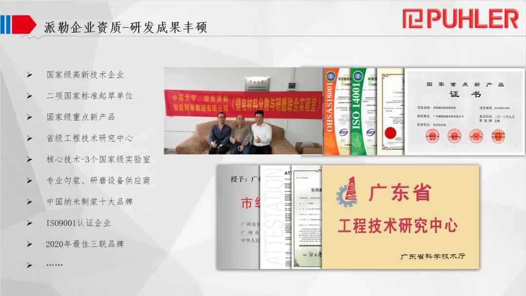 派勒集团旗下子公司“广东派勒智能纳米科技股份有限公司”(简称:派勒智能)创立于2007年9月,公司总部位于广州市番禺区。派勒智能作为国内“装配式新能源材料研磨系统解决方案先行者”, 公司从2015年开始转型升级和产品迭代升级。主要从事锂电池正负极材料输送、计量配混、纳米研磨、气流粉碎系统及锂离子电池(LIB)电极浆料匀浆分散系统等智能装备的高新技术企业,已实现专业核心设备的自主生产和全系统产品线的进口替代。将单一设备集成模式升级为模块化集成装配,极大地缩短生产、安装、调试周期。此外,公司智能化单体设备在新材料、有色金属矿、非金属矿、制药、油漆、精细化工等不同材料领域也有广泛应用。