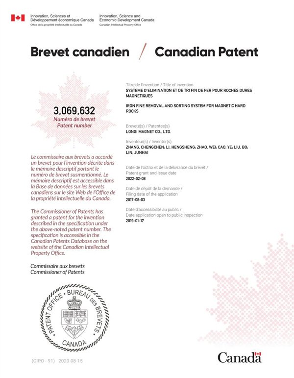 2021年,该设备获得澳大利亚专利,此次再获加拿大专利授权,隆基顽石除铁系统国际化之路越走越宽。