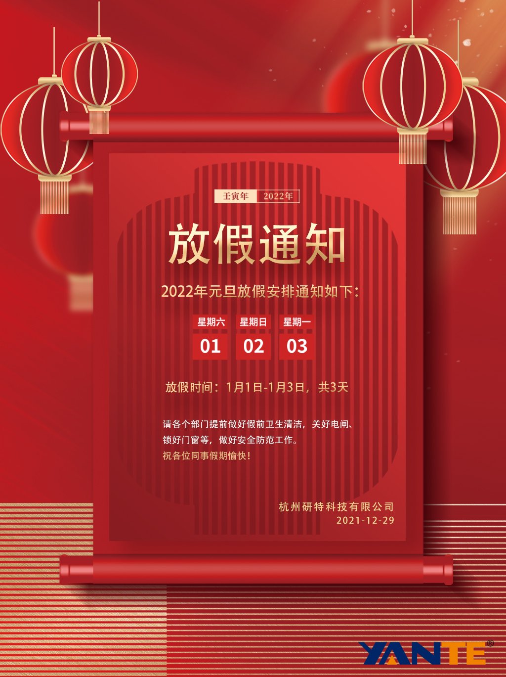 辞旧迎新,风鹏正举。2022年元旦来临,研特科技在此向大家献上最真挚的祝福和诚挚的谢意。根据国务院办公厅放假安排,现将放假时间及注意事项通知如下: