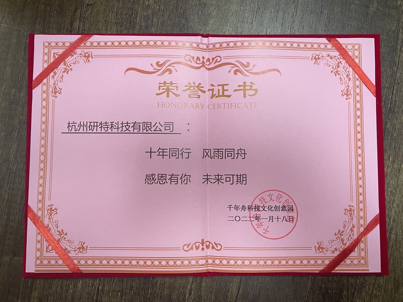 杭州研特科技有限公司于2010年入驻千年舟,十年来,和园区共奋斗,同进步,倍感光荣。徐总代表本司参与本次颁奖典礼,并且荣获“十年创业同行”奖,乘风破浪,研特科技愿与园区共成长。
