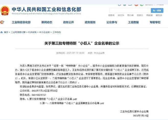 关于第三批专精特新“小巨人”企业名单的公示