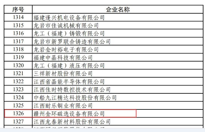 近期,国家工业和信息化部公示了第三批国家专精特新“小巨人”企业名单,赣州金环磁选设备有限公司成功入选,荣获国家专精特新“小巨人”企业称号。