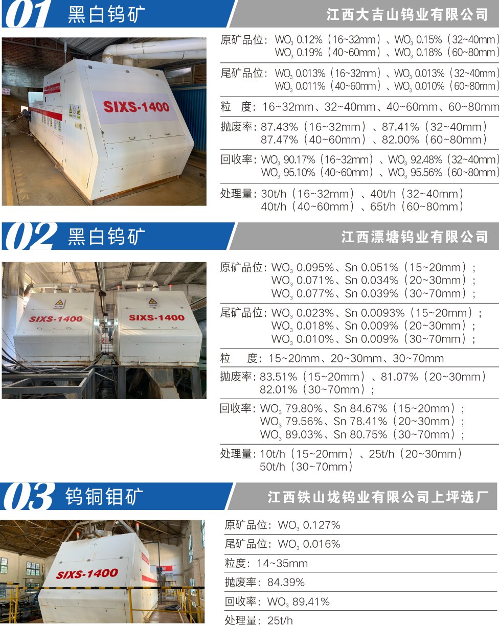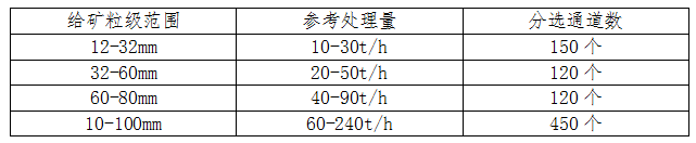 适用于钨矿、锑矿、锡矿、铅锌银矿、铜矿、金矿、钼矿等有色金属、贵金属、稀有金属矿以及长石、石英等非金属的预选抛尾工艺,替代人工手选作业、全磨全选,可大幅提高粗选抛废率,提高入磨品位,扩大产能,提质增效,降低选矿成本,实现矿山智能化生产。SIXS型装备可分选10-100mm粒级范围矿石,最大处理能力达240t/h。主要性能参数见表1。