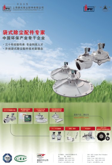 上海袋式除尘配件有限公司是国内生产袋式除尘器配件品种最为齐全、质量最为优异著名企业。30年来,上海袋配生产的袋式除尘产品被运用于世界各地的钢铁冶金、水泥、火力发电、化工、建筑,垃圾焚烧等行业中的粉尘治理和烟气净化,产品出口到美国、欧洲、日本及东南亚等地区,在国内外市场享有很高的声誉和知名度。上海袋配产品有电磁脉冲阀、清灰控制仪、滤袋、滤袋框架、专用配件、电气控制柜及过滤筒等。