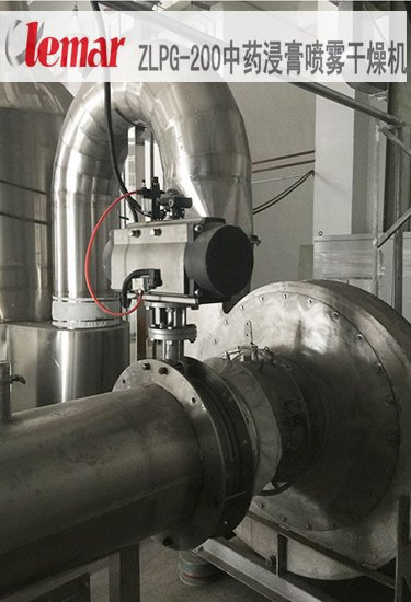 ZLPG-200中药浸膏喷雾干燥塔,该塔内外壁及管道均采用了SUS304食品级不锈钢材质,选用了LPG-300型高速离心雾化器, 雾化盘直径为0.15m,转速为15500r/min。