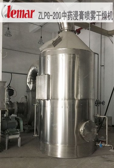 济川药业集团此次订购的ZLPG-200中药浸膏喷雾干燥,塔径为5米,塔高为12米,蒸汽耗量为500Kg/h,干燥进风温度t1=180℃,干燥排风温度t2=90℃。分别用于干燥三拗片浸膏和小儿豉翘浸膏物料,该物料的PH值在4—6范围内,初始水分: 80 ~85%(视物料的流动性可提高),物料最终水分:≤5% (粉体吸湿性强);水分蒸发量: 200Kg/h;料液温度:常温~85℃;料液比重: ≤1.1g/cm3。