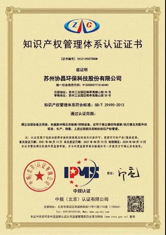 近日,苏州协昌环保科技股份有限公司荣获《知识产权管理体系认证证书》,这表示协昌环保知识产权管理体系符合标准:GB/T 29490-2013。烟尘治理设备及系统、电磁脉冲阀及其检测/控制设备、应用于除尘器的传感器/执行器及其配件的研发、生产、销售、上述过程相关采购的知识产权管理通过认证。